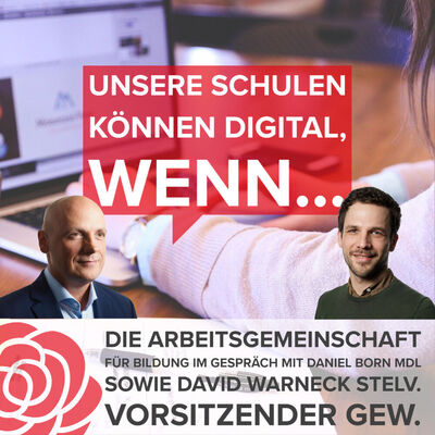 Die Arbeitsgemeinschaft für Bildung (AfB) der SPD Heidelberg und SPD Rhein-Neckar veranstalten zusammen mit Daniel Born MdL und David Warneck stellv. Vorsitzende und Digitalisierungsexperte der GEW BaWü eine Diskussion zum Thema "Corona Schuljahr: Unsere Schulen können digital, wenn…"